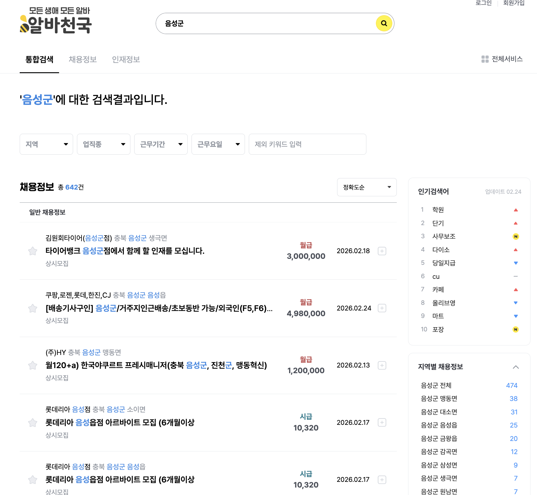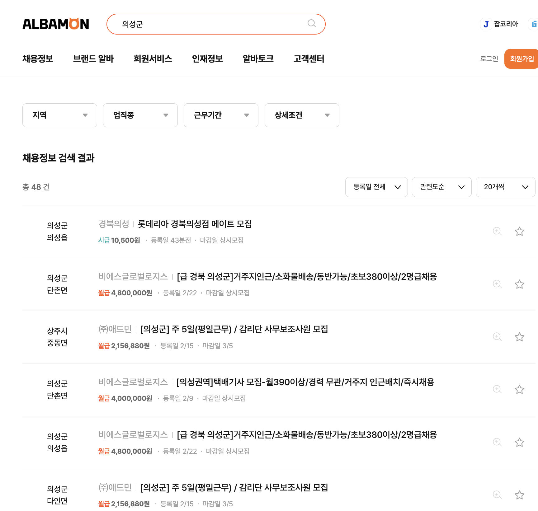 | 롯데리아 경북의성점 | 매장 메이트 (단순 서빙/주문) | 시급 10,500원 | 의성읍 |