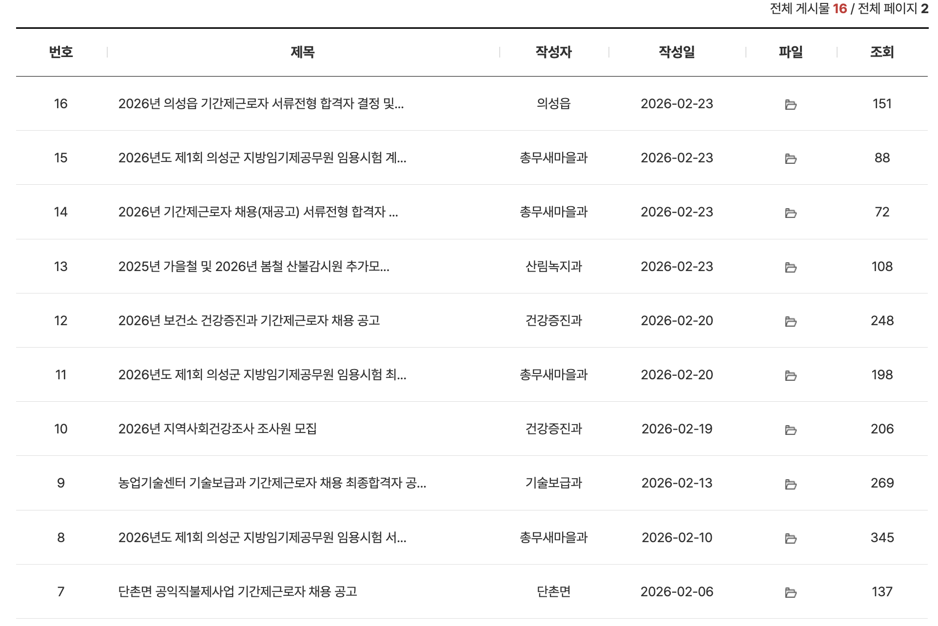 | 보건소 (건강증진과) | 2026년 보건소 건강증진과 기간제근로자 채용 | 2026. 02. 20 | 247건 |