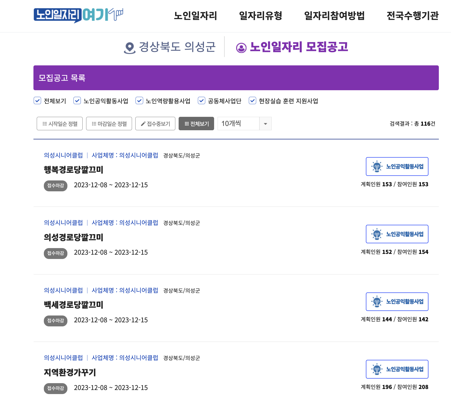 '노인일자리 여기' 데이터에 따르면 의성군은 총 116건에 달하는 방대한 시니어 일자리 프로그램을 운영하고 있으며, 주요 사업별로 약 150명에서 200명에 가까운 대규모 인원을 선발합니다.